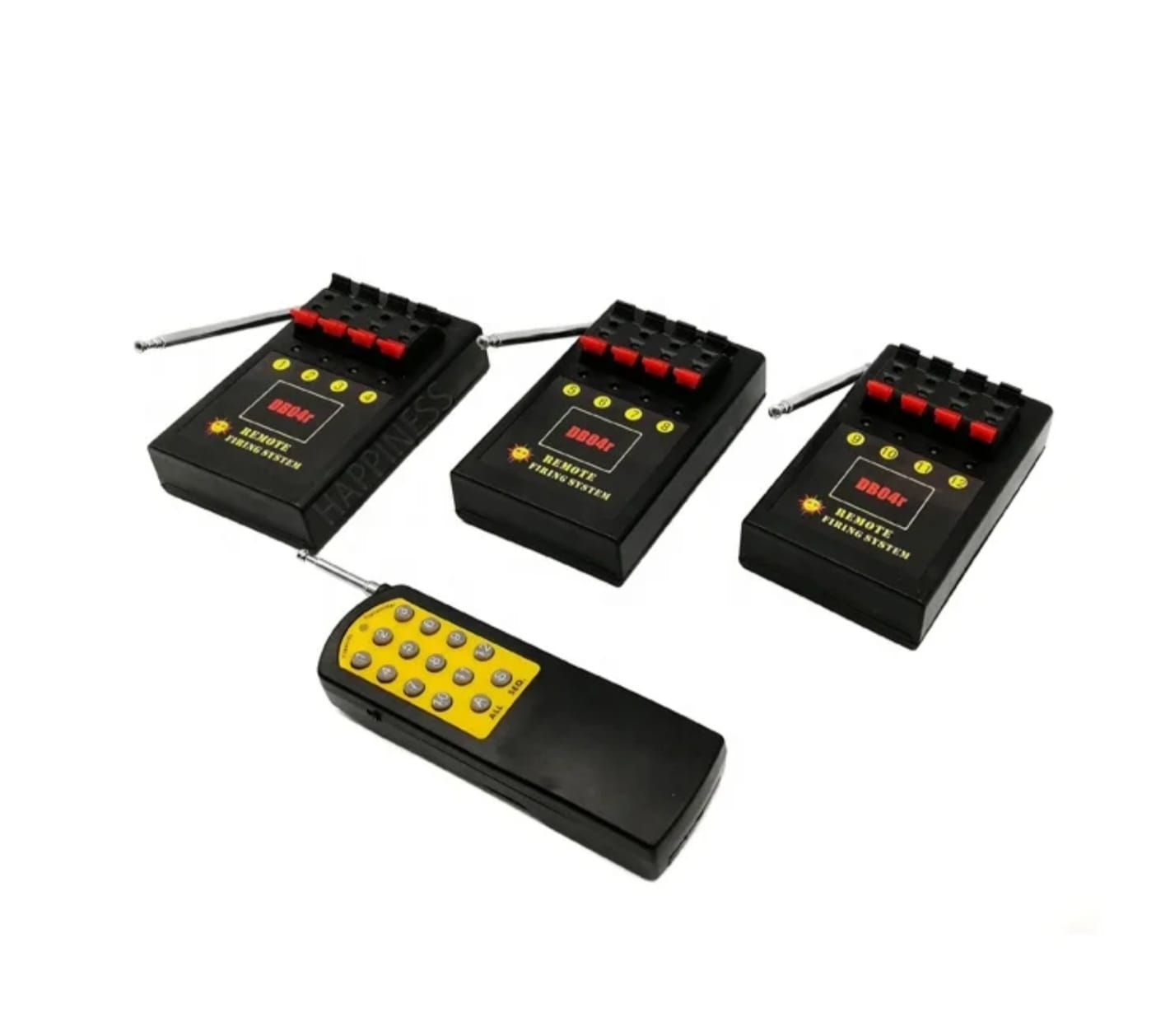 12 Kanal Funkzündanlagen System im Koffer, bestehend aus Fernbedienung mit EIN/AUS Schalter und 3 Empfänger Modulen mit je 4 Zündkanälen.