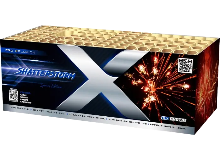 Die Shatterstorm ist ein kraftvolles Verbundfeuerwerk, das eine dynamische Licht‑ und Klangshow erzeugt. Sie startet mit moving stars und neon‑Flash‑Effekten, die den Himmel kräftig erleuchten. Im Verlauf baut sie sich spektakulär auf, steigert Intensität und Effekte.