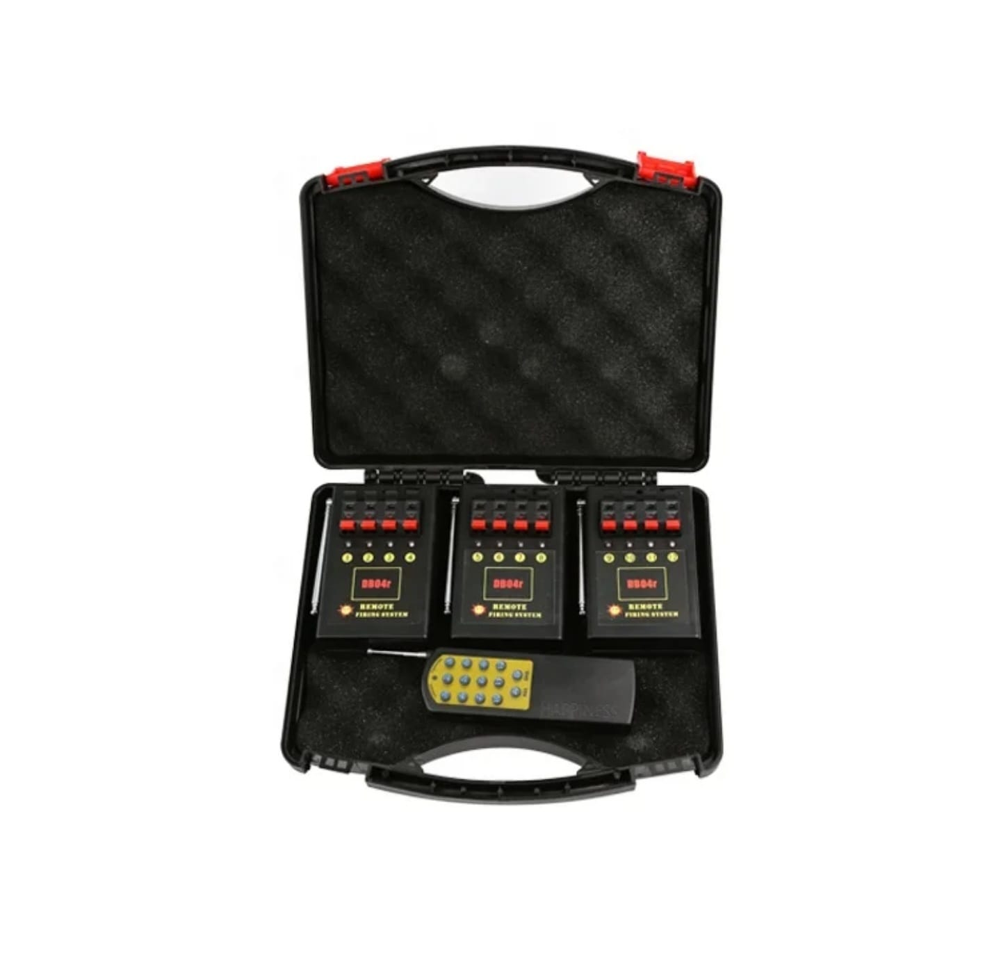 12 Kanal Funkzündanlagen System im Koffer, bestehend aus Fernbedienung mit EIN/AUS Schalter und 3 Empfänger Modulen mit je 4 Zündkanälen.