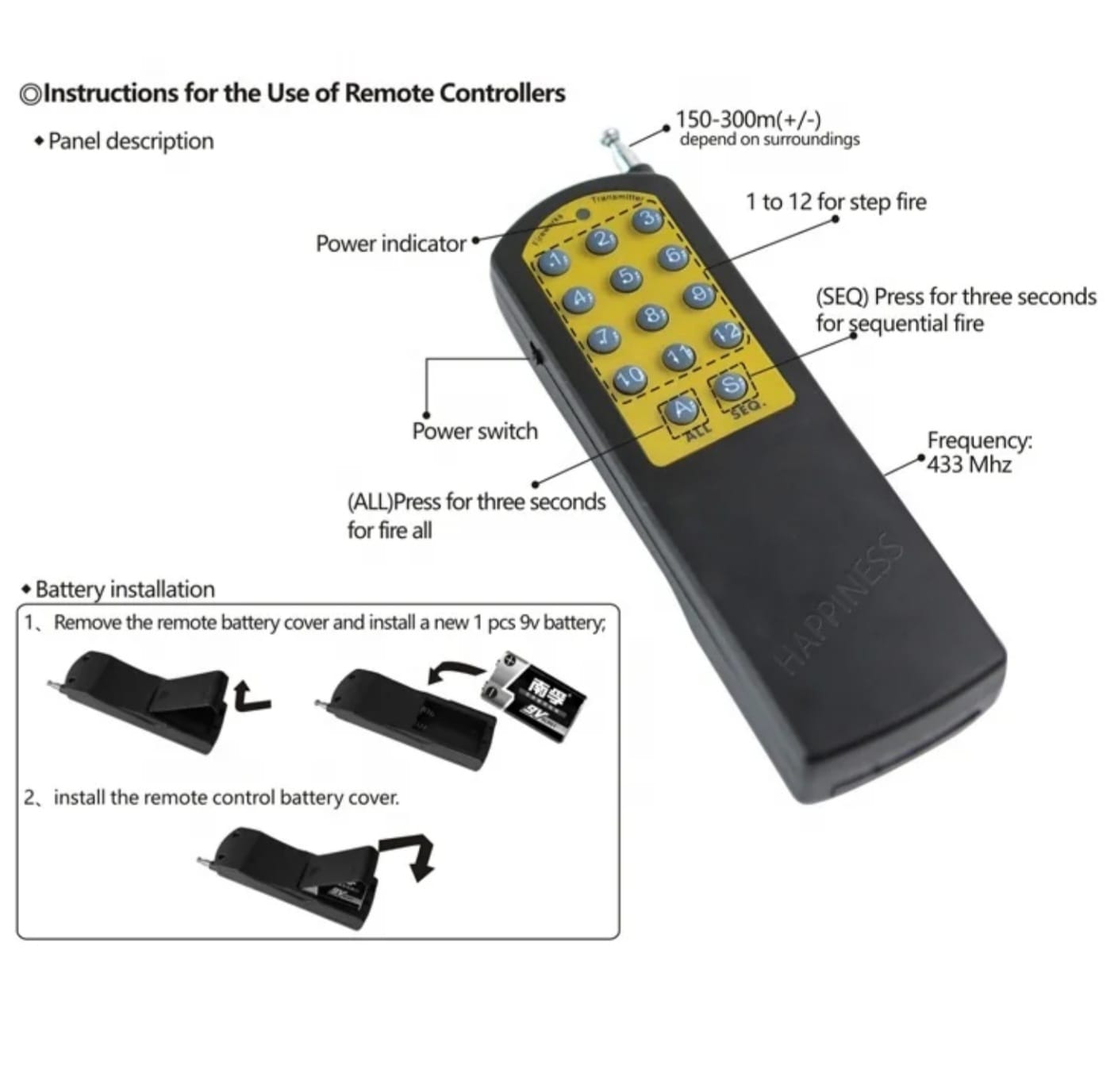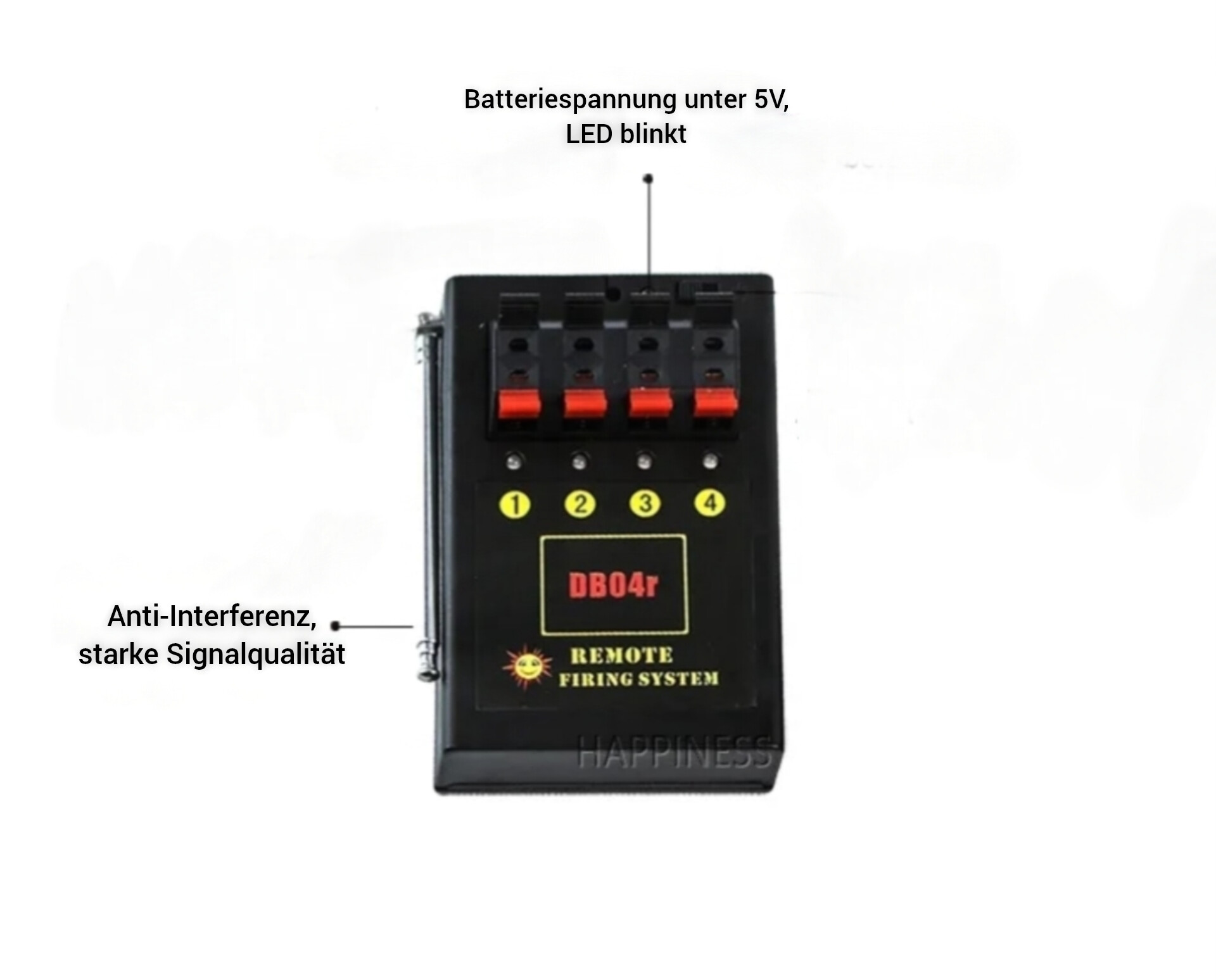 - Fernbedienung wird mit 9V Block Batterie* bestückt